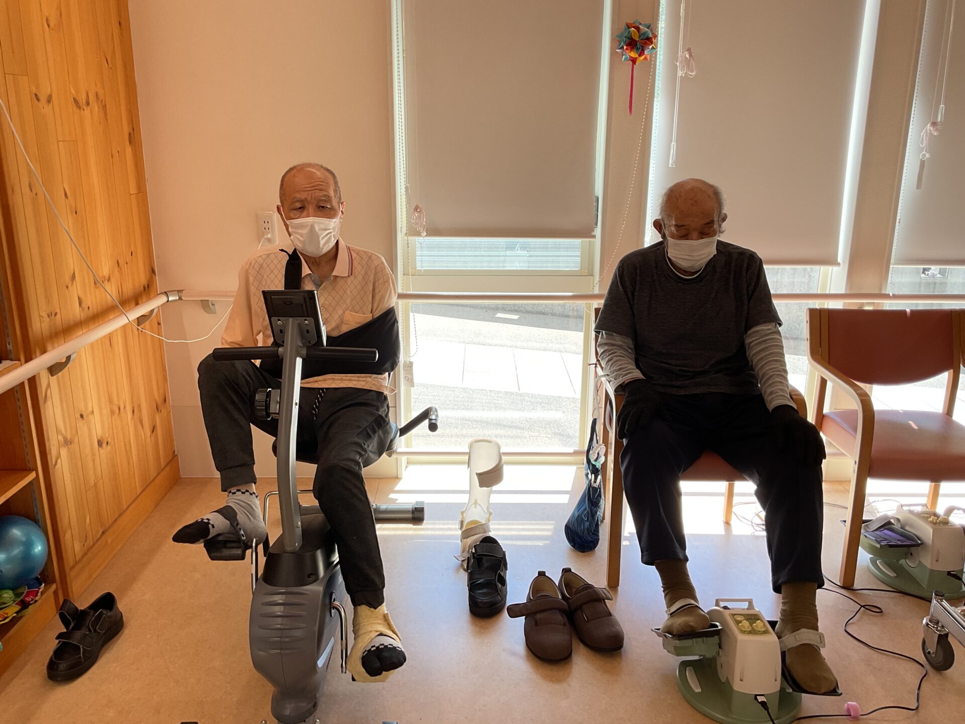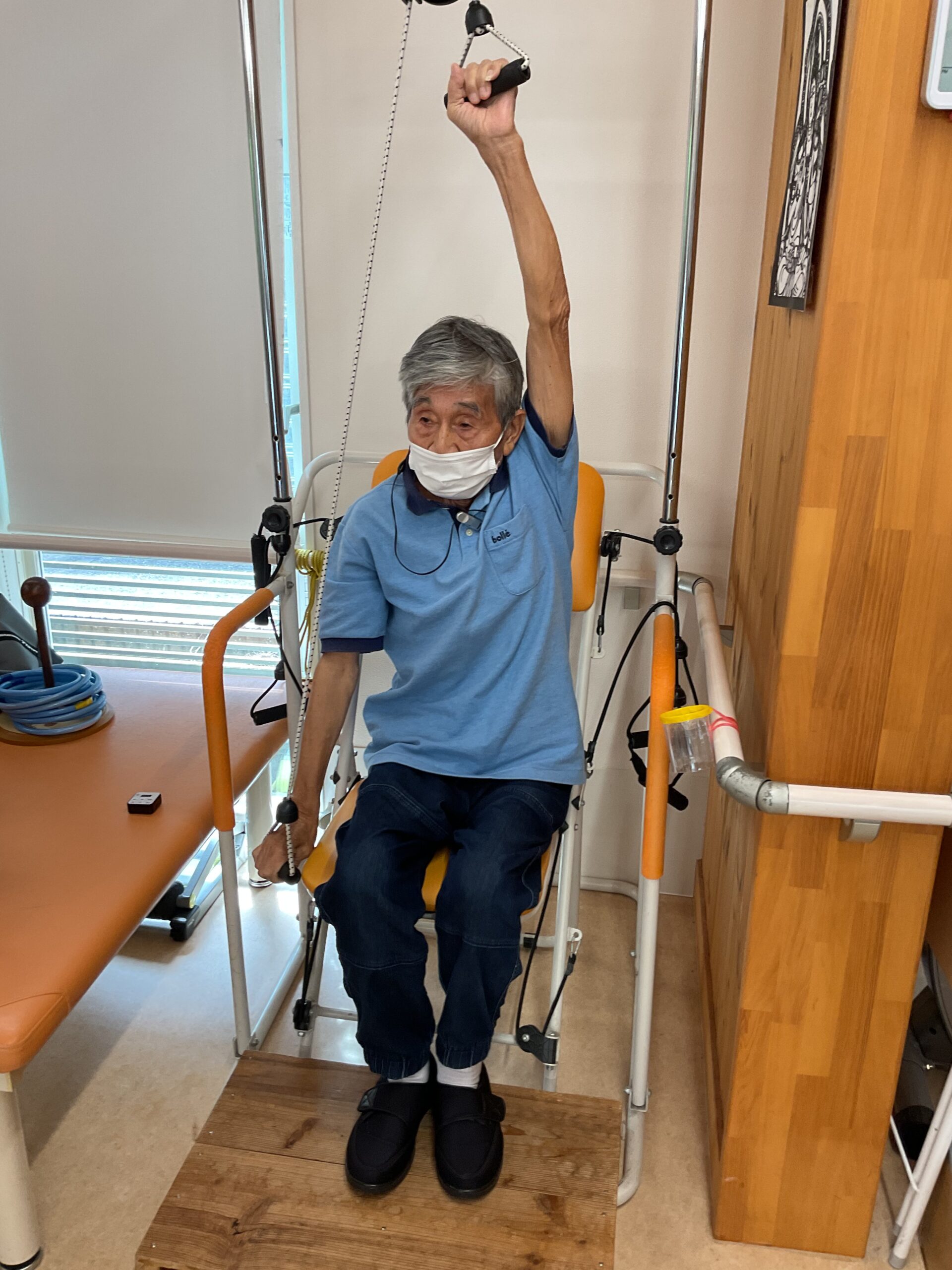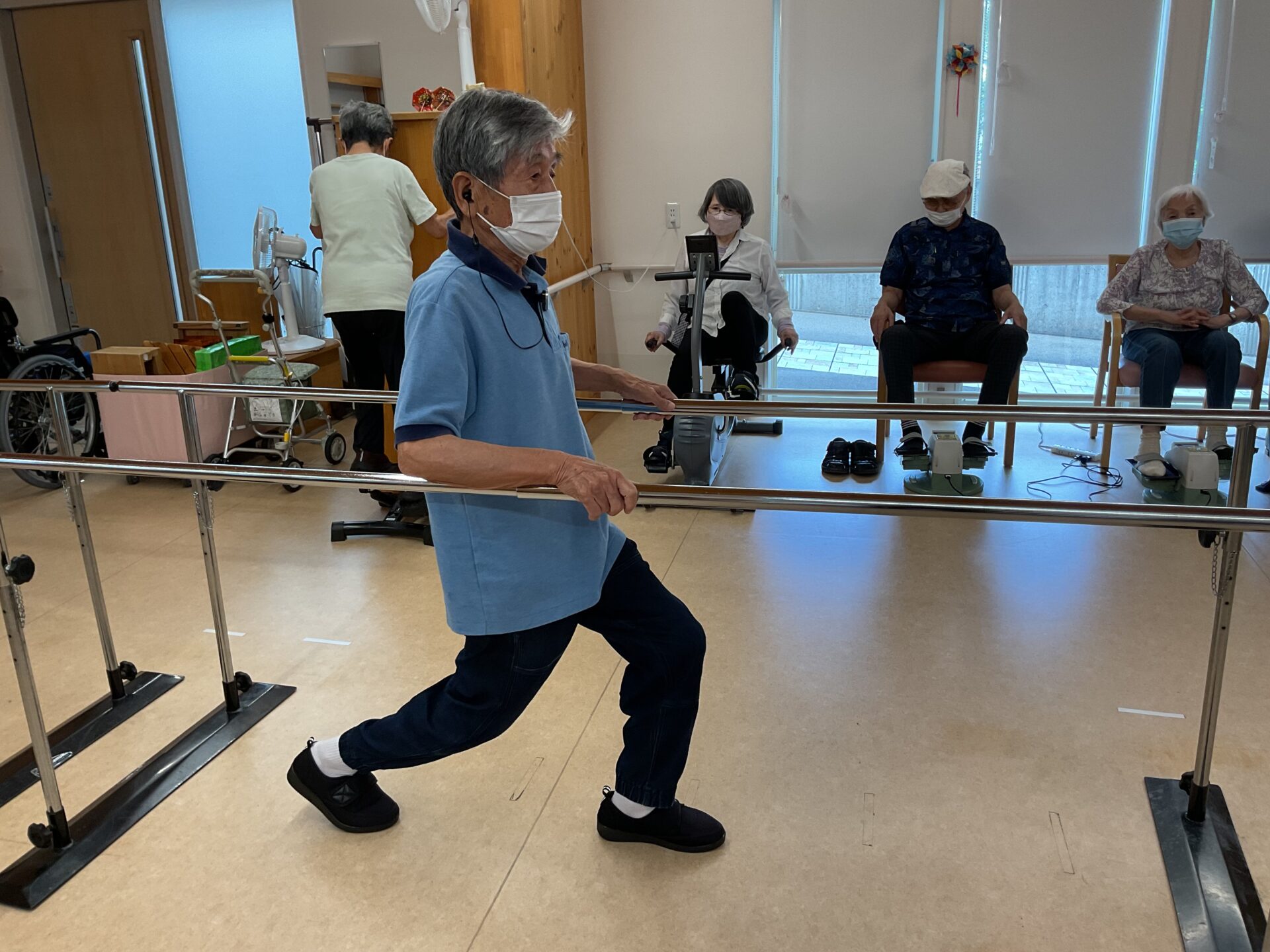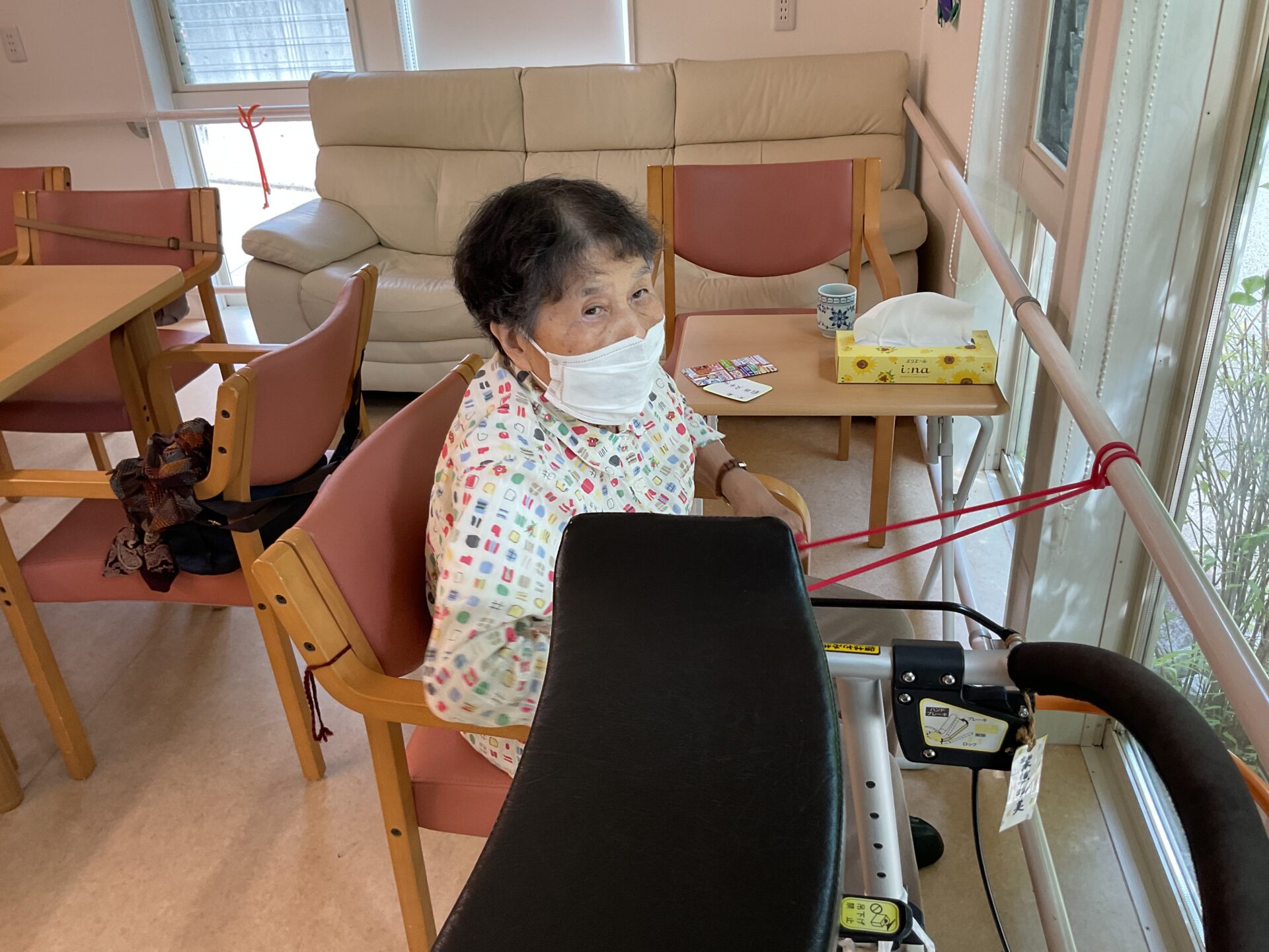 天井が高く明るい広々としたデイルームでお一人お一人に合わせたプログラムに沿って、マシンを利用したリハビリ運動を実施しています。